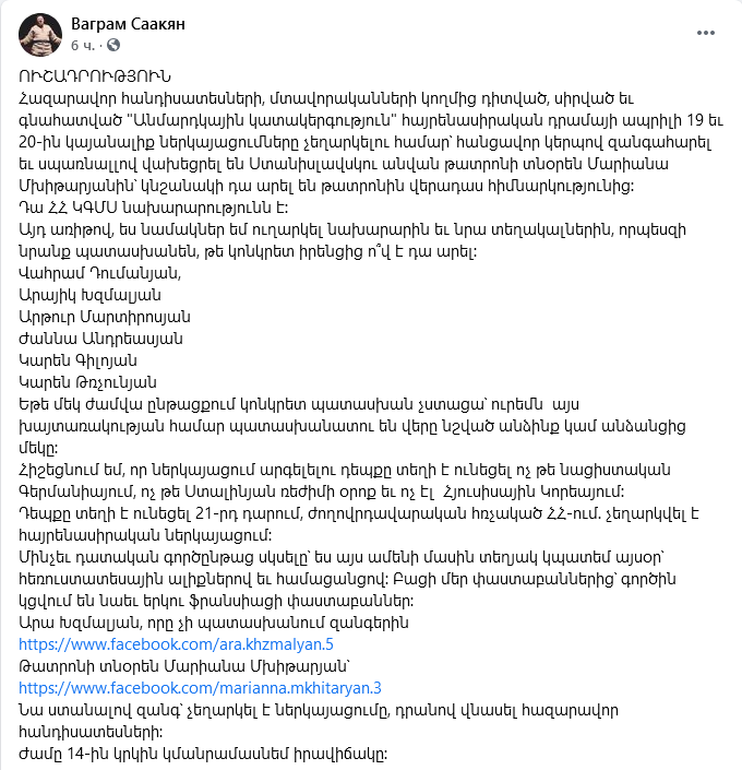 Հազարավոր հանդիսատեսների, մտավորականների կողմից դիտված, սիրված եւ գնահատված «Անմարդկային կատակերգություն» հայրենասիրական դրամայի ապրիլի 19 եւ 20-ին կայանալիք ներկայացումները չեղարկելու համար՝ հանցավոր կերպով զանգահարել եւ սպառնալով վախեցրել են Ստանիսլավսկու անվան թատրոնի տնօրեն Մարիանա Մխիթարյանին՝ կնշանակի դա արել են թատրոնին վերադաս հիմնարկությունից։ Այս մասին իր ֆեյսբուքյան էջում հայտնում է ռեժիսոր, բեմադրիչ Վահրամ Սահակյանը: