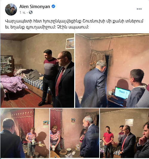 ՀՀ ԱԺ փոխխոսնակ Ալեն Սիմոնյանը իր ֆեյսբուքյան էջում լուսանկարներ է հրապարակել Նիկոլ Փաշինյանի Շուռնուխ չհայտարարված այցից: