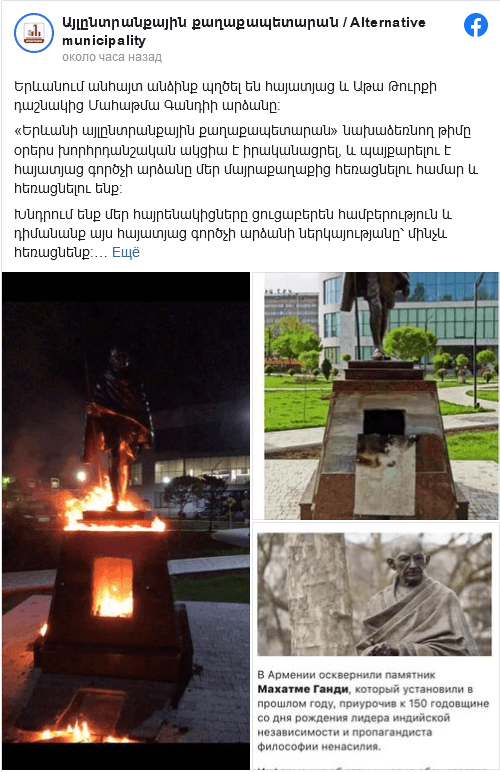 Երևանում անհայտ անձինք պղծել են հայատյաց և Աթա Թուրքի դաշնակից Մահաթմա Գանդիի արձանը։ Այս մասին հայտնում է «Երևանի այլընտրանքային քաղաքապետարան նախաձեռնության մամուլի ծառայությունը: