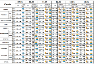 Մայիսի 09-ին կեսօրից հետո, 10-ի գիշերը և առավոտյան ժամերին ժամանակ առ ժամանակ շրջանների զգալի մասում սպասվում է անձրև և ամպրոպ (տեղ-տեղ ինտենսիվ), բարձր լեռնային շրջաններում տեղումները սպասվում են ձյան տեսքով: Մայիսի 10-ի և 13-14-ի ցերեկը առանձին շրջաններում սպասվում է կարճատև անձրև և ամպրոպ: Առանձին հատվածներում հնարավոր է կարկուտ։ Մայիսի 11-12-ին, 13-ի գիշերը սպասվում է առանց տեղումների եղանակ։ Քամին՝ հարավ-արևմտյան՝ 5-10մ/վրկ, ամպրոպի ժամանակ առանձին շրջաններում սպասվում է քամու ուժգնացում 15-20մ/վրկ: Օդի ջերմաստիճանը մայիսի 10-ին, 11-ի գիշերը կնվազի 5-7, այնուհետև աստիճանաբար կբարձրանա 6-8 աստիճանով: