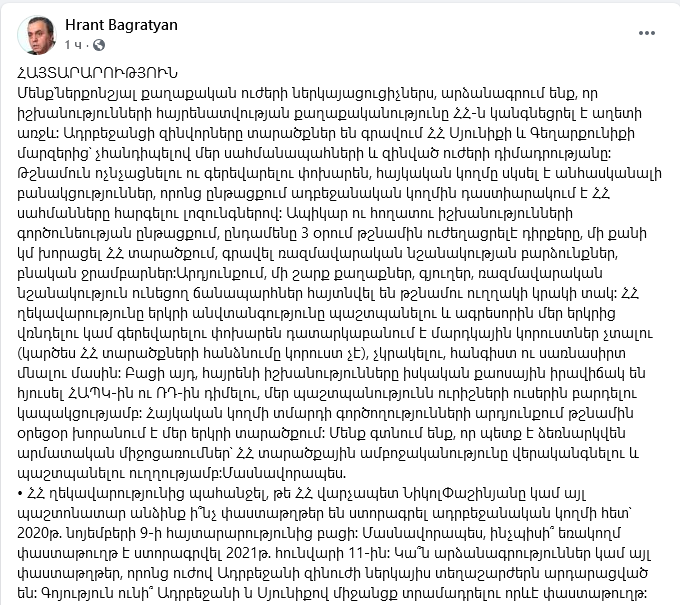«Մենք՝ ներքոնշյալ քաղաքական ուժերի ներկայացուցիչներս, արձանագրում ենք, որ իշխանությունների հայրենատվության քաղաքականությունը ՀՀ-ն կանգնեցրել է աղետի առջև։ Ադրբեջանցի զինվորները տարածքներ են գրավում ՀՀ Սյունիքի և Գեղարքունիքի մարզերից՝ չհանդիպելով մեր սահմանապահների և զինված ուժերի դիմադրությանը։ Թշնամուն ոչնչացնելու ու գերեվարելու փոխարեն, հայկական կողմը սկսել է անհասկանալի բանակցություններ, որոնց ընթացքում ադբեջանական կողմին դաստիարակում է ՀՀ սահմանները հարգելու լոզունգներով։ Ապիկար ու հողատու իշխանությունների գործունեության ընթացքում, ընդամենը 3 օրում թշնամին ուժեղացրելէ դիրքերը, մի քանի կմ խորացել ՀՀ տարածքում, գրավել ռազմավարական նշանակության բարձունքներ, բնական ջրամբարներ։Արդյունքում, մի շարք քաղաքներ, գյուղեր, ռազմավարական նշանակություն ունեցող ճանապարհներ հայտնվել են թշնամու ուղղակի կրակի տակ։ ՀՀ ղեկավարությունը երկրի անվտանգությունը պաշտպանելու և ագրեսորին մեր երկրից վռնդելու կամ գերեվարելու փոխարեն դատարկաբանում է մարդկային կորուստներ չտալու (կարծես ՀՀ տարածքների հանձնումը կորուստ չէ), չկրակելու, հանգիստ ու սառնասիրտ մնալու մասին։ Բացի այդ, հայրենի իշխանությունները իսկական քաոսային իրավիճակ են հյուսել ՀԱՊԿ-ին ու ՌԴ-ին դիմելու, մեր պաշտպանությունն ուրիշների ուսերին բարդելու կապակցությամբ։ Հայկական կողմի տմարդի գործողությունների արդյունքում թշնամին օրեցօր խորանում է մեր երկրի տարածքում։ Մենք գտնում ենք, որ պետք է ձեռնարկվեն արմատական միջոցառումներ՝ ՀՀ տարածքային ամբոջականությունը վերականգնելու և պաշտպանելու ուղղությամբ։Մասնավորապես.
