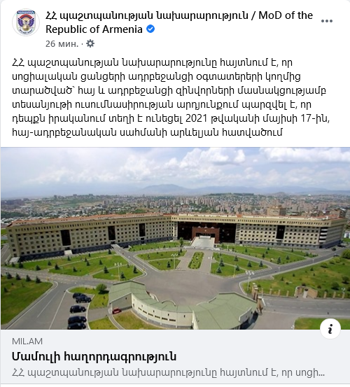 ՀՀ պաշտպանության նախարարությունը հայտնում է, որ սոցիալական ցանցերի ադրբեջանցի օգտատերերի կողմից տարածված` հայ և ադրբեջանցի զինվորների մասնակցությամբ տեսանյութի ուսումնասիրության արդյունքում պարզվել է, որ դեպքն իրականում տեղի է ունեցել 2021 թվականի մայիսի 17-ին, հայ-ադրբեջանական սահմանի արևելյան հատվածում: