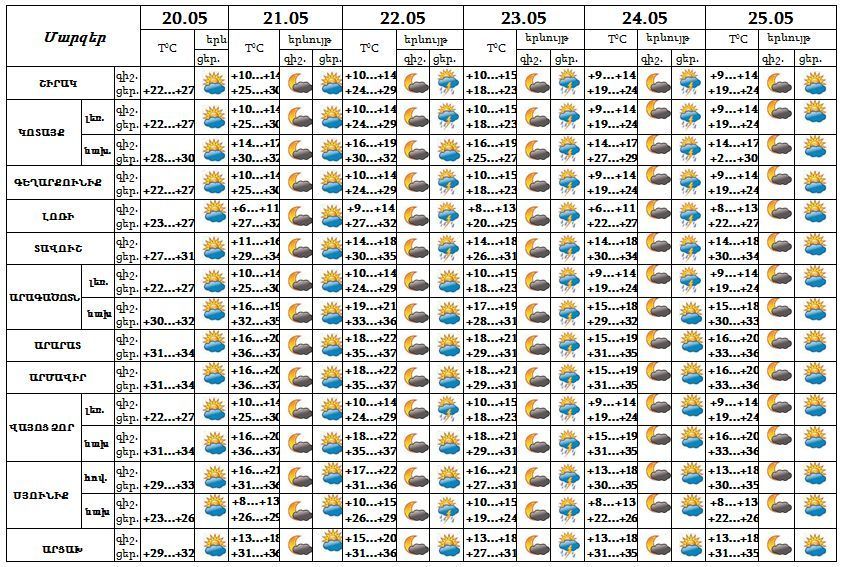 Մայրաքաղաքում մայիսի 21–ի գիշերը սպասվում է 16-18 աստիճան տաքություն, իսկ ցերեկային ժամերին կգրանցվի +34….+36 աստիճան։»