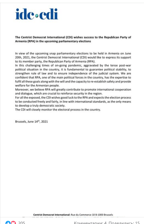 Հաշվի առնելով առաջիկա արտահերթ խորհրդարանական ընտրությունները, որոնք տեղի են ունենալու 2021 թվականի հունիսի 20-ին Հայաստանում, Կենտրոնամետ Դեմոկրատների Միջազգային Միությունը (CDI) իր աջակցությունն է հայտնում մեր անդամ կուսակցությանը` Հայաստանի հանրապետական կուսակցությանը: