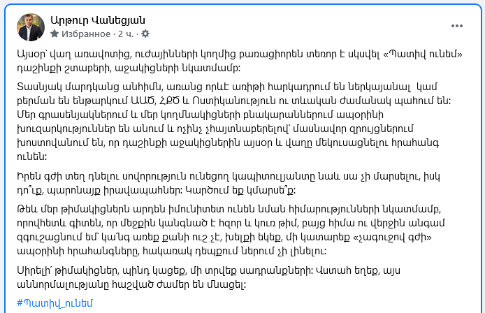 «Այսօր՝ վաղ առավոտից, ուժայինների կողմից բառացիորեն տեռոր է սկսվել «Պատիվ ունեմ» դաշինքի շտաբերի, աջակիցների նկատմամբ: