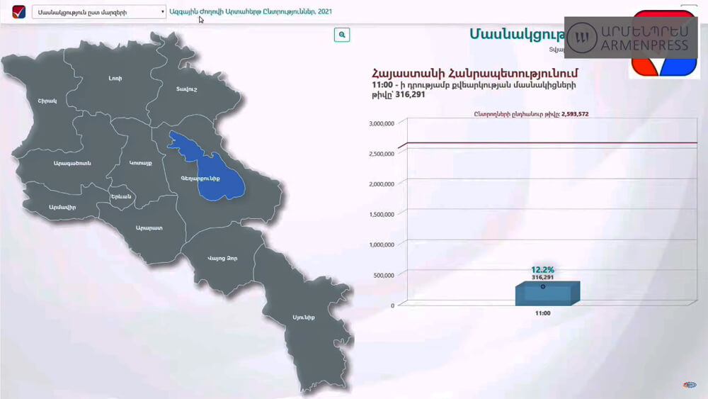 Կենտրոնական ընտրական հանձնաժողովի հայտարարած նախնական տվյալների համաձայն, ժամը 11:00-ի դրությամբ, Հայաստանի արտահերթ խորհրդարանական ընտրություններին քվեարկել է ընտրողների 12,2 տոկոսը կամ 316.291 մարդ:
