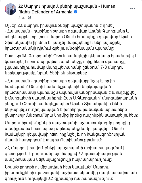 «Այսօր ՀՀ մարդու իրավունքների պաշտպանին է դիմել «Հայաստան» դաշինքի շտաբի ղեկավար Արմեն Գևորգյանը և տեղեկացրել, որ Լոռու մարզի Օձուն համայնքի ղեկավար Արսեն Տիտանյանին իր մոտ է կանչել մարզպետը և ներկայացրել հրաժարականի դիմում գրելու անօրինական պահանջ:
