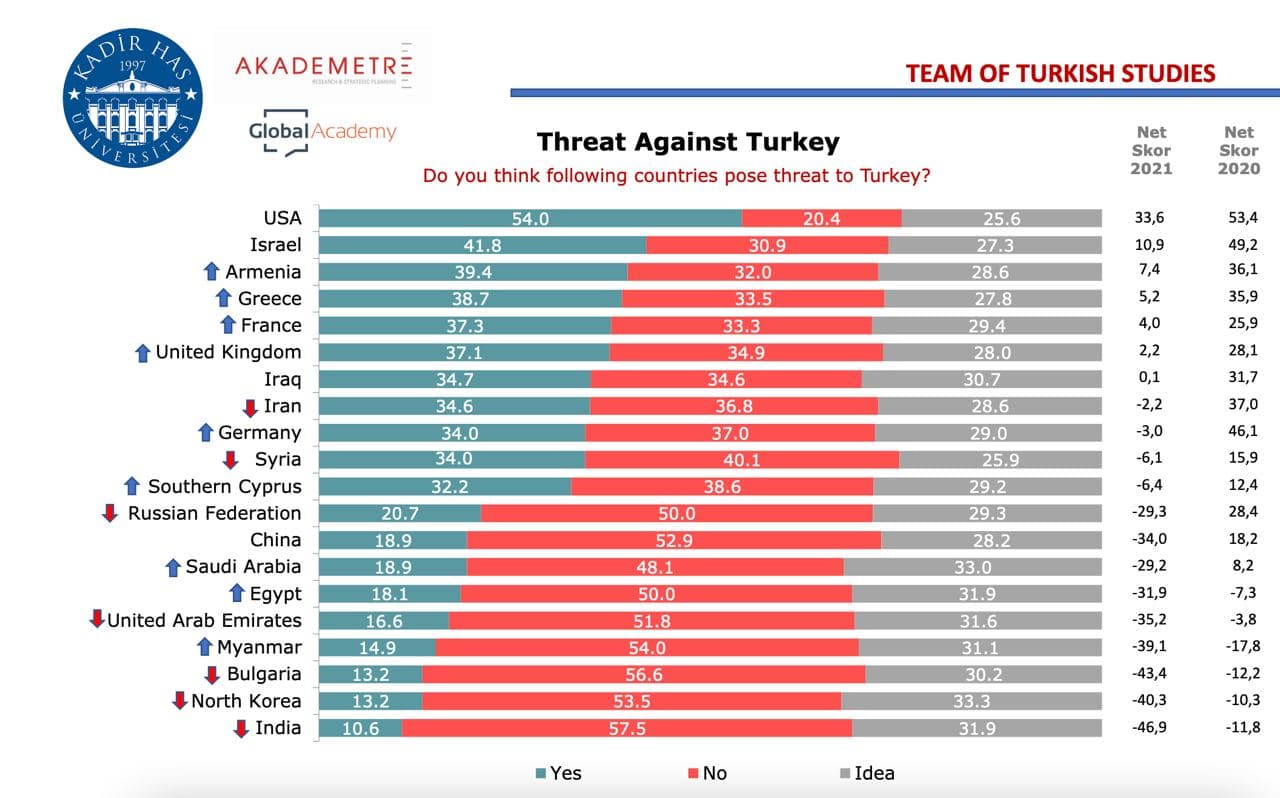 «Ո՞ր երկրներն են վտանգ ներկայացնում Թուրքիայի համար» հարցին թուրքերի 39.4 %-ը պատասխանել է «Հայաստան»։ Մեզանից «առաջ են» միայն ԱՄՆ-ն և Իսրայելը։