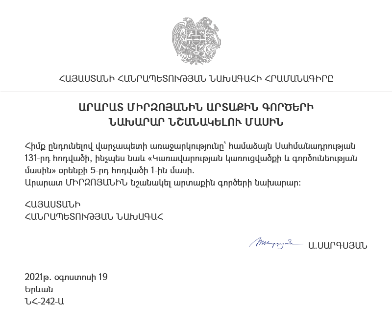 Հայաստանի Հանրապետության նախագահ Արմեն Սարգսյանի հրամանագրով Արարատ Միրզոյանը նշանակվել է ՀՀ արտաքին գործերի նախարար: