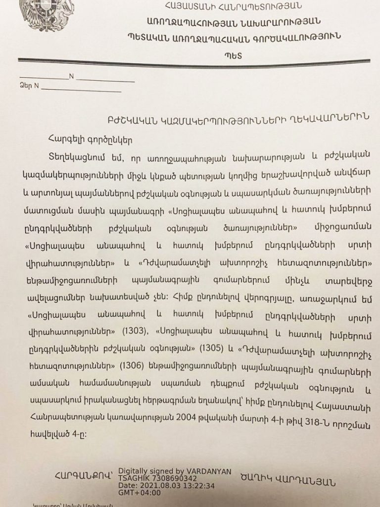 Պարզաբանումների համար դիմել ենք Առողջապահության նախարարություն, արձագանքը կհարապարակենք ամբողջությամբ: