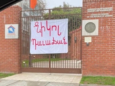 «Քիչ առաջ ԱՄՆ Գլենդել քաղաքից մեր ընթերցողներն ուղարկեցին այս լուսանկարը, որում պատկերված է Գլենդելում Հայաստանի հանրապետության գլխավոր հյուպատոսության մուտքը, վրան ցուցանակ` «Նիկոլ դավաճան»:»