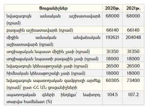 Մաասնավորապես՝ 2021թ․-ին նվազագույն ամսական աշխատավարձը կազմել է 68000 դրամ, իսկ մեկ շնչի հաշվով նվազագույն սպառողական զամբյուղի ամսական արժեքը՝ շուրջ 73400 դրամ։