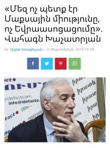 Խաչատրյանը փաստորեն դեմ է եղել Մաքսային միություն մտնելուն`ինչը նաև ենթադրում է ԵԱՏՄ-ին է դեմ եղել:Ավելի զավեշտալի է,որ փաստորեն նա դեմ է եղել նաև եվրաասոցիացմանը: