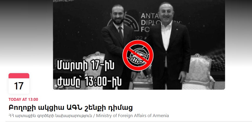 Հինգշաբթի օրը՝ մարտի 17-ին, ժամը 13։00-ին ՀՅԴ Հայաստանի երիտասարդական միությունը և Հայաստանի Հանրապետական կուսակցության Երիտասարդական եւ ուսանողական կազմակերպությունները միասնական ակցիա են իրականացնելու Արտաքին գործերի նախարարության շենքի դիմաց՝ ԱԳՆ նախարարի պաշտոնակատարին հիշեցնելով, որ ինքը չի ներկայացնում հայ ժողովրդի իրական շահերը։