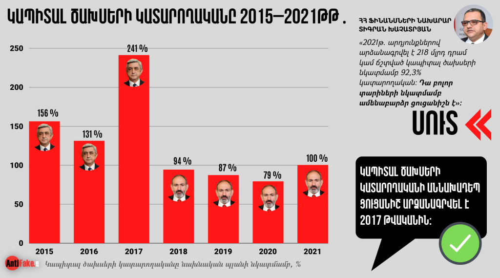 Տեղեկատվական հարթակը հայտնում է, որ իրականում կապիտալ ծախսերի կատարողականի աննախադեպ ցուցանիշ արձանագրվել է 2017 թվականին։ Այդ տարի կապիտալ ծախսերը ի սկզբանե պլանավորվածի համեմատ գերակատարվել են շուրջ 2.4 անգամ (98.6 մլրդ նախապես պլանավորվածի փոխարեն փաստացի իրականացվելով 237.4 մլրդ դրամ): Հետևաբար, այս ցուցանիշով ներկա կառավարությունը դեռևս հեռու է նախորդ կառավարության դրական արդյունքներից: (Գրաֆիկ 1)