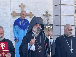 ՍՏԵՓԱՆԱԿԵՐՏ, 27 սեպտեմբերի, ԱՐՑԱԽՊՐԵՍ: «Արցախպրես»-ի թղթակցի հաղորդմամբ՝ Խաչերթի մեկնարկից առաջ եկեղեցու բակում հավաքվածներին խոսքով է դիմել ՀԱԵ Արցախի թեմի փոխառաջնորդ Տեր Սահակ վարդապետ Շաքարյանը: