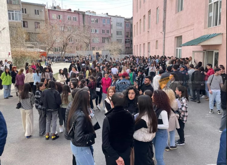 ԵՐԵՎԱՆ, 15 մարտի – Sputnik. Վալերի Բրյուսովի անվան պետական համալսարանի ուսանողներն այս պահին բուհի դիմաց դասադուլ են անում․ նրանք դեմ են ռեկտորի ժամանակավոր պաշտոնակատար Դավիթ Գյուրջինյանի նշանակմանը։
