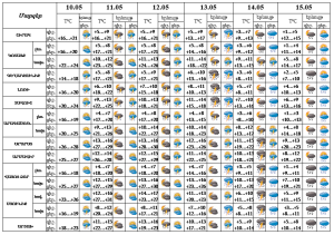 Մարզերում մայիսի 10-ին կեսօրից հետո, մայիսի 11-ի և 12-ի գիշերը և կեսօրից հետո առանձին շրջաններում, մայիսի 13-15-ը շրջանների զգալի մասում սպասվում է անձրև և ամպրոպ, առանձին վայրերում հնարավոր է կարկուտ։
