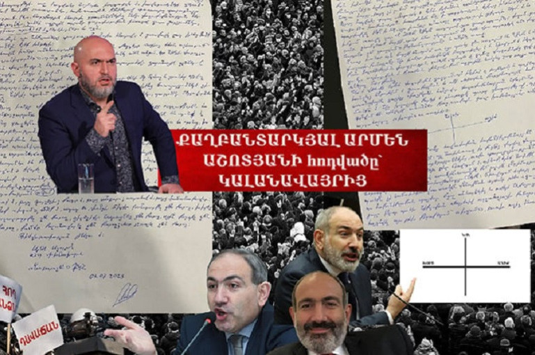 Այլ է վիճակը երկրի քաղաքական դաշտում, որն ինչքան էլ բազմերանգ և պոլիմորֆ է, այնուհանդերձ ենթարկվում է դասակարգման և ունի սեփական կոորդինատային համակարգ, որի առանցքային ցուցիչը Փաշինյանի հանցավոր քաղաքականության նկատմամբ վերաբերմունքն է: Այդ իրողությունը կարելի է բնութագրել պարզ գծապատկերով, որի բևեռներում գտնվում են սիմվոլիկ անուններ կրող, սակայն դառը իրականությունն ամբողջությամբ արտահայտող «խուցն» ու «աղիքը»:»
