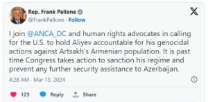 «Միանում եմ ANCA-ին և իրավապաշտպաններին, որոնք ԱՄՆ-ին կոչ են անում Ալիևին պատասխանատվության ենթարկել Լեռնային Ղարաբաղի հայ բնակչության դեմ ցեղասպանական քաղաքականության համար։ Վաղուց արդեն ժամանակն է, որ Կոնգրեսը քայլեր ձեռնարկի՝ նրա (Ալիևի) նկատմամբ պատժամիջոցներ կիրառելու և Ադրբեջանին անվտանգության ոլորտում հետագա ցանկացած աջակցություն կանխարգելելու ուղղությամբ», — գրել է կոնգրեսականը։