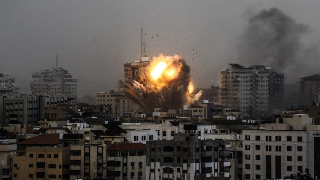 A smoke rises and ball of fire over a buildings in Gaza City on October 9, 2023 during an Israeli air strike. (Photo by Sameh Rahmi/NurPhoto via Getty Images)