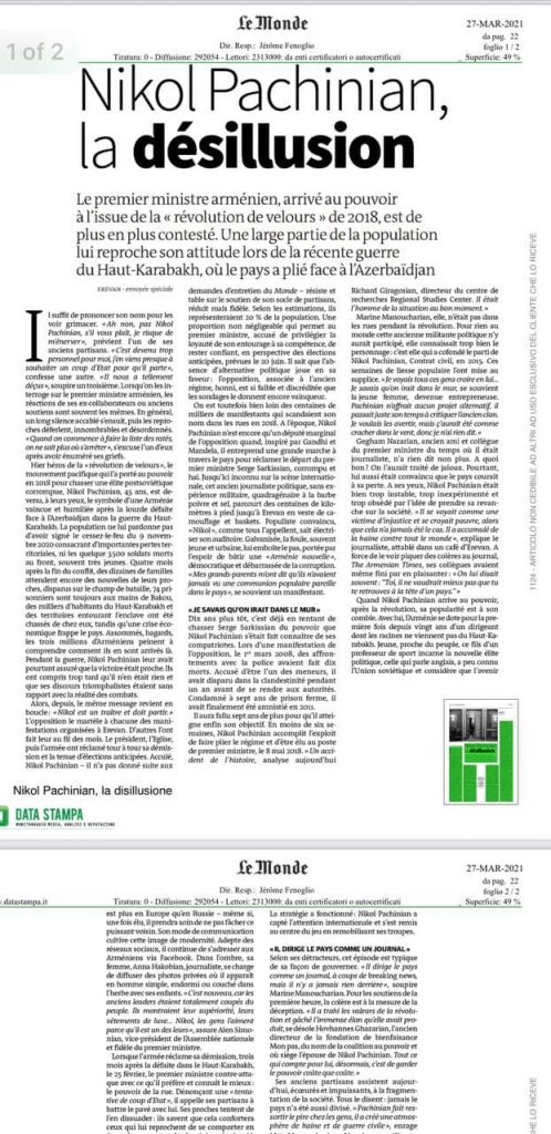 Ֆրանսիական հեղինակավոր Le Monde պարբերականն անդրադարձել է Հայաստանում ստեղծված իրավիճակին ու Նիկոլ Փաշինյանի ֆիասկոյին: