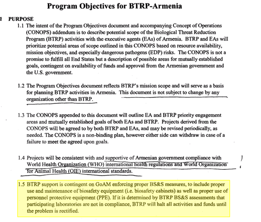 Так, например, в плане биологической деятельности США в Армении на 2020-2025 гг., который представляет собой договор между правительством Армении и Агентством по снижению угрозы МО США указано, что в случае невыполнения армянской стороной каких-либо требований и условий американцев финансирование немедленно прекращается.