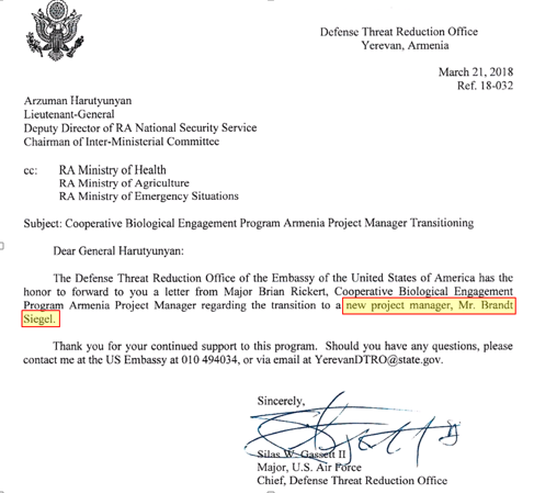 Среди переданных документов особый интерес у нашей редакции вызвало официальное письмо DTRA с уведомлением армянской стороны о назначении нового руководителя биологической программы американского военного ведомства в Республике. Произошло это в марте 2018 года, за пару месяцев до прихода к власти на волне прозападных протестов действующего премьер-министра Никола Пашиняна. Без объяснения причин Соединенные Штаты поставили во главе своих военно-биологических проектов Брандта Сигеля, ранее проявившего себя в качестве руководителя аналогичных проектов DTRA в Украине, где также обеспокоены деятельностью США. Независимые эксперты и журналисты отмечают, что результаты проводимых исследований используются американскими военными для создания нового вида биологического оружия, направленного на представителей славянского этноса (https://strana.ua/news/263131-laboratorii-ssha-v-ukraine-chto-o-nikh-izvestno.html).