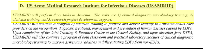 Помимо этого, в разный период времени в биологических проектах DTRA по изучению особо опасных инфекций в Армении были задействованы специалисты американских военно-медицинских организаций, таких как Военно-морской медицинский исследовательский центр NMRC-F, НИИ Сухопутных войск им. Уолтера Рида (WRAIR) и НИИ инфекционных болезней ВС США (USAMRIID).