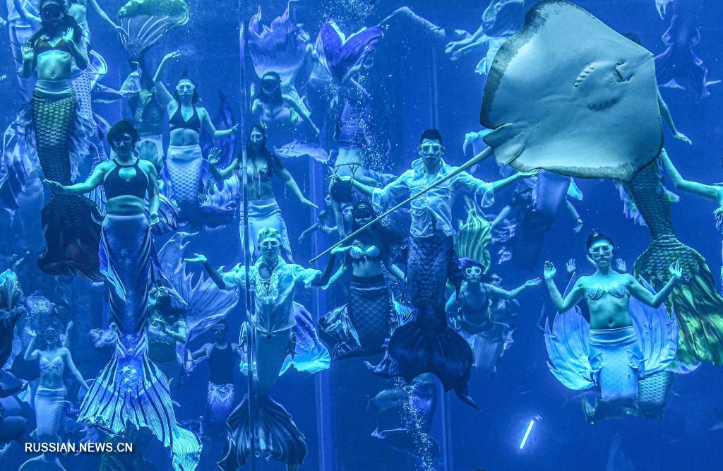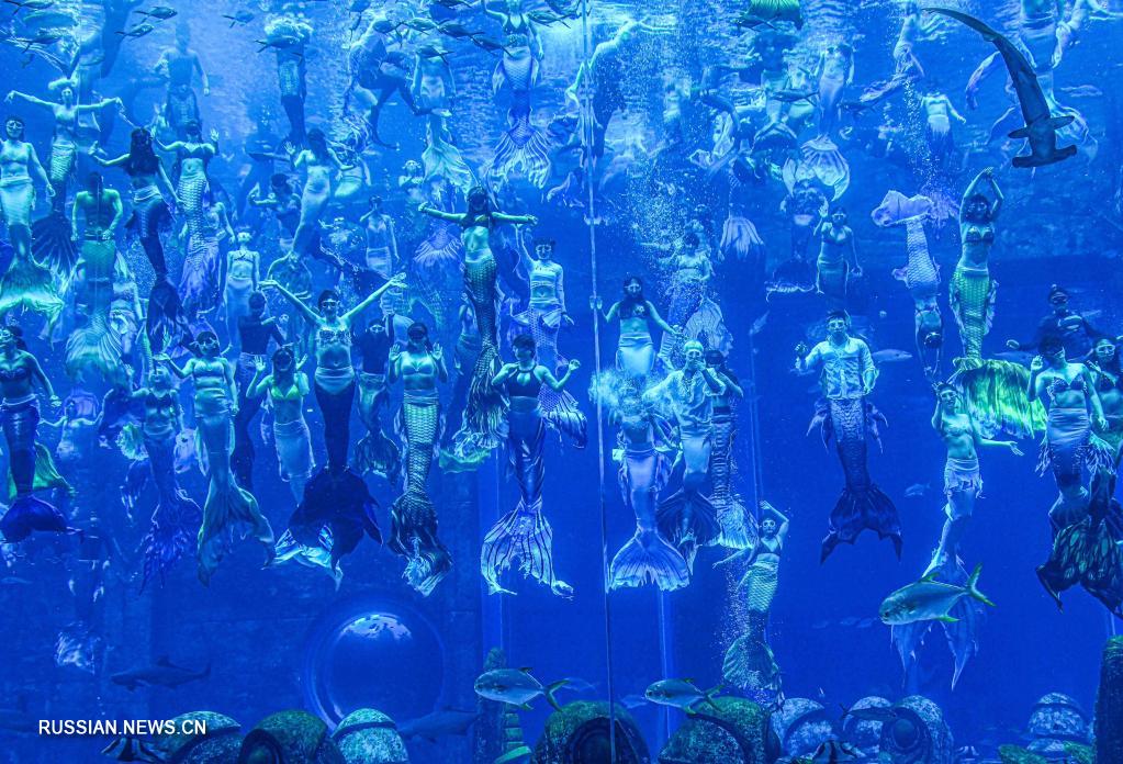 110 артистов в образе русалок погрузились в гигантский аквариум «Посольская лагуна» отеля Atlantis Sanya в городе Санья /провинция Хайнань, Южный Китай/ и выполнили серию сложных движений под водой, таких как «совместное плавание ста рыб», «групповой переход», «взявшиеся за руки пары», «подъем с факелом», «поворот на 360 градусов» и «плавание на боку», установив новый мировой рекорд Гиннесса в номинации «Самое масштабное подводное шоу русалок».