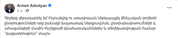 «Ночью я вернулся из Брюсселя и утром явился в Следственный комитет, чтобы дать «разъяснения» по поводу позорного вовлечения армии в день выборов, озвученных оценок и сообщений о нарушениях на выборах», — написал он.