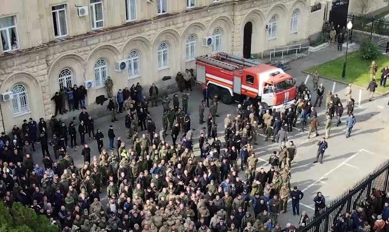 Протестующие протаранили «Уралом» ворота и прорвались на территорию парламента, передает с места корреспондент @SputnikAbkhazia. Сейчас идут стычки с силовиками.