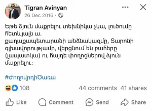 Мэр Еревана Тигран Авинян удалил свой пост, сделанный еще в 2016 году, в котором он посоветовал тогдашнему мэру расчищать снег вместе с сотрудниками мэрии.