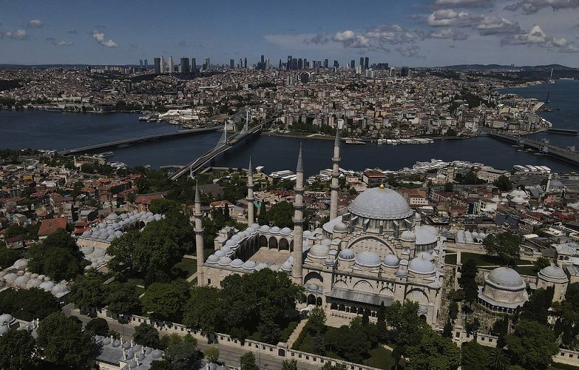 An aerial view of the historical Suleymaniye Mosque, foreground, and the Golden Horn, centre, leading to the Bosporus Strait, right, separating Europe and Asia, in Istanbul, during the third day of Eid el-Fitr and the last day of a four-day curfew, due to the coronavirus outbreak, Tuesday, May 26, 2020. Municipality workers disinfected several mosques which were locked down for more than six weeks and will be partly open again for prayers on Friday, May 29. The Muslim holiday marking the end of the fasting month of Ramadan, traditionally a time of gathering, was marked by a nationwide lockdown to combat the coronavirus. (AP Photo/Emrah Gurel)
